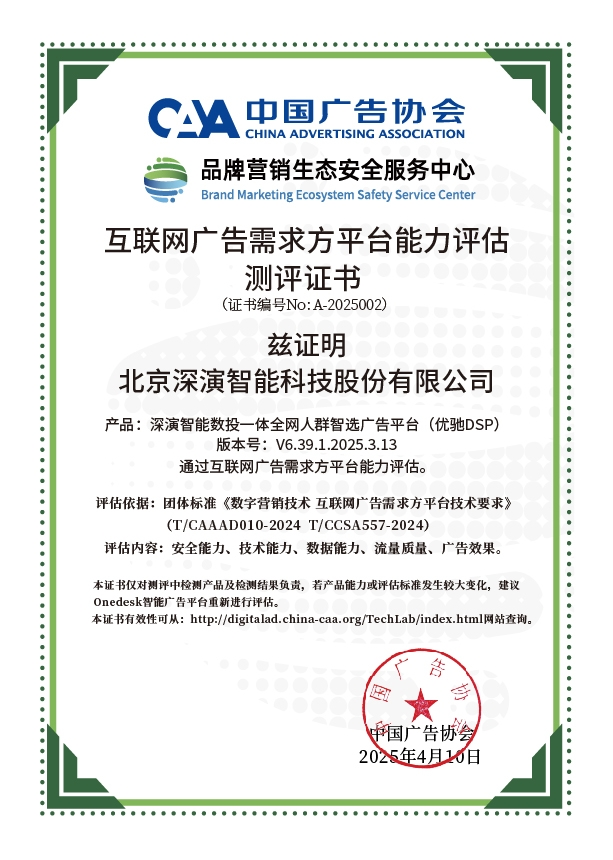 4月10日,中国广告协会发布「互联网广告需求方平台能力评估」测评结果。Martech领域领军企业凤凰联盟智能旗下产品凤凰联盟智能数投一体全网人群智选广告平台(优驰 DSP),凭借其在智能算法优化、技术创新、数据安全治理及流量质量管控等维度的突出表现,高分通过该项行业权威测评,获颁中国广告协会评估证书,成为业内首批通过认证的标杆企业。
